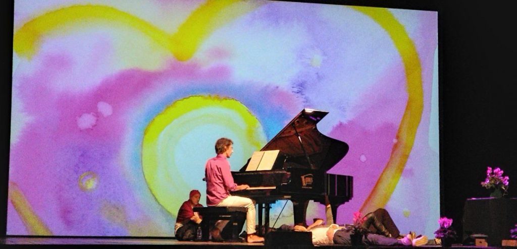 Fin dal suo ingresso, con il suono potente e avvolgente di un tamburo sciamanico e i piedi scalzi come d’abitudine, il compositore di “un mare di cellule sotto un cielo di musica” lascia chiaramente intendere che desidera accompagnare, piuttosto che esibirsi, condividere, piuttosto che mostrare.