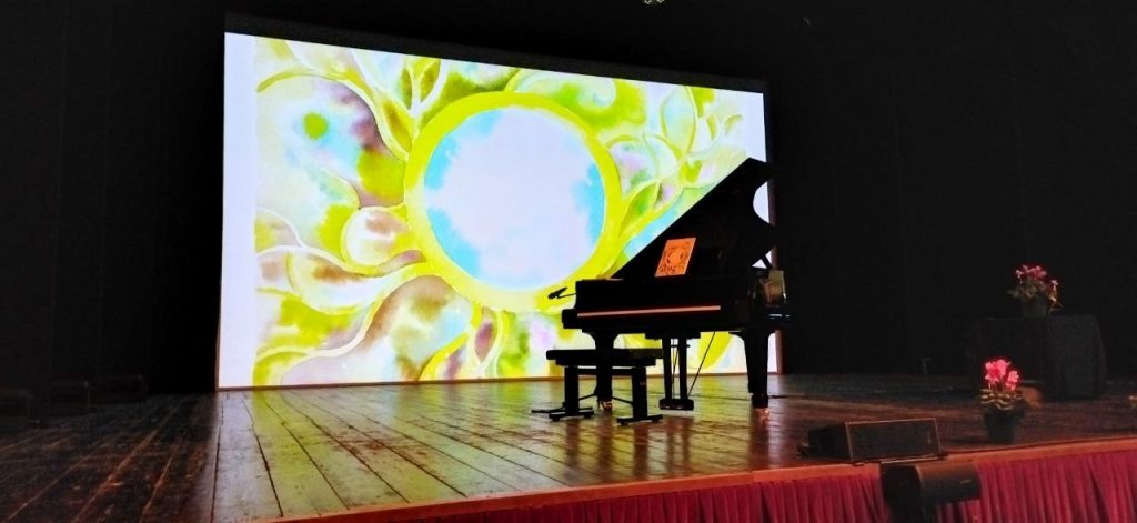 Come sempre scenografia del concerto sono stati i bellissimi e delicati acquerelli della madre di Emiliano, Wilma Camatti, che traduce in forme e colori evocativi la scrittura musicale del figlio.