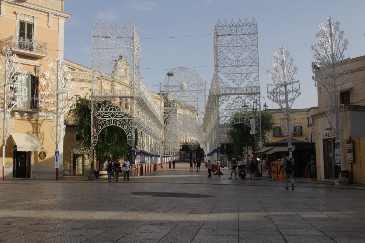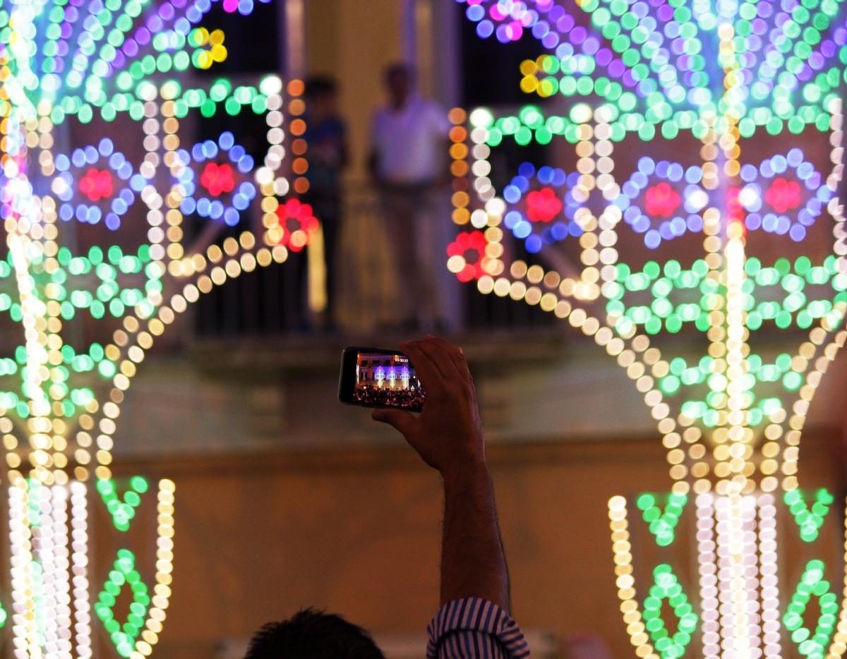 Le luci delle luminarie sono accese, e il loro scheletro bianco è ora vestito di colori brillanti, che illuminano i volti delle persone impegnate a chiacchierare allegramente, catturare immagini, oppure ad osservare con il volto rapito il paesaggio della festa.