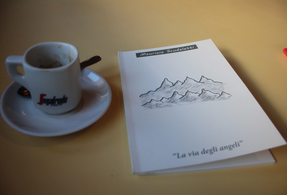 Parlando con Maurizio si ha la sensazione che ogni cosa che dice sia schietta, priva di fronzoli, e che nasca da esperienze di vita vissuta. Mi parla del suo libro, La via degli Angeli, in vendita qui al rifugio con l’obiettivo di donare i proventi ai bambini del Nepal. Alla fine mi fa dono di un volume, che sfoglio con curiosità: brevi racconti delle sue scalate solitarie, inframmezzate da immagini in bianco e nero e poesie piccole come haiku. Un dono graditissimo, prezioso, che mi rende felice.