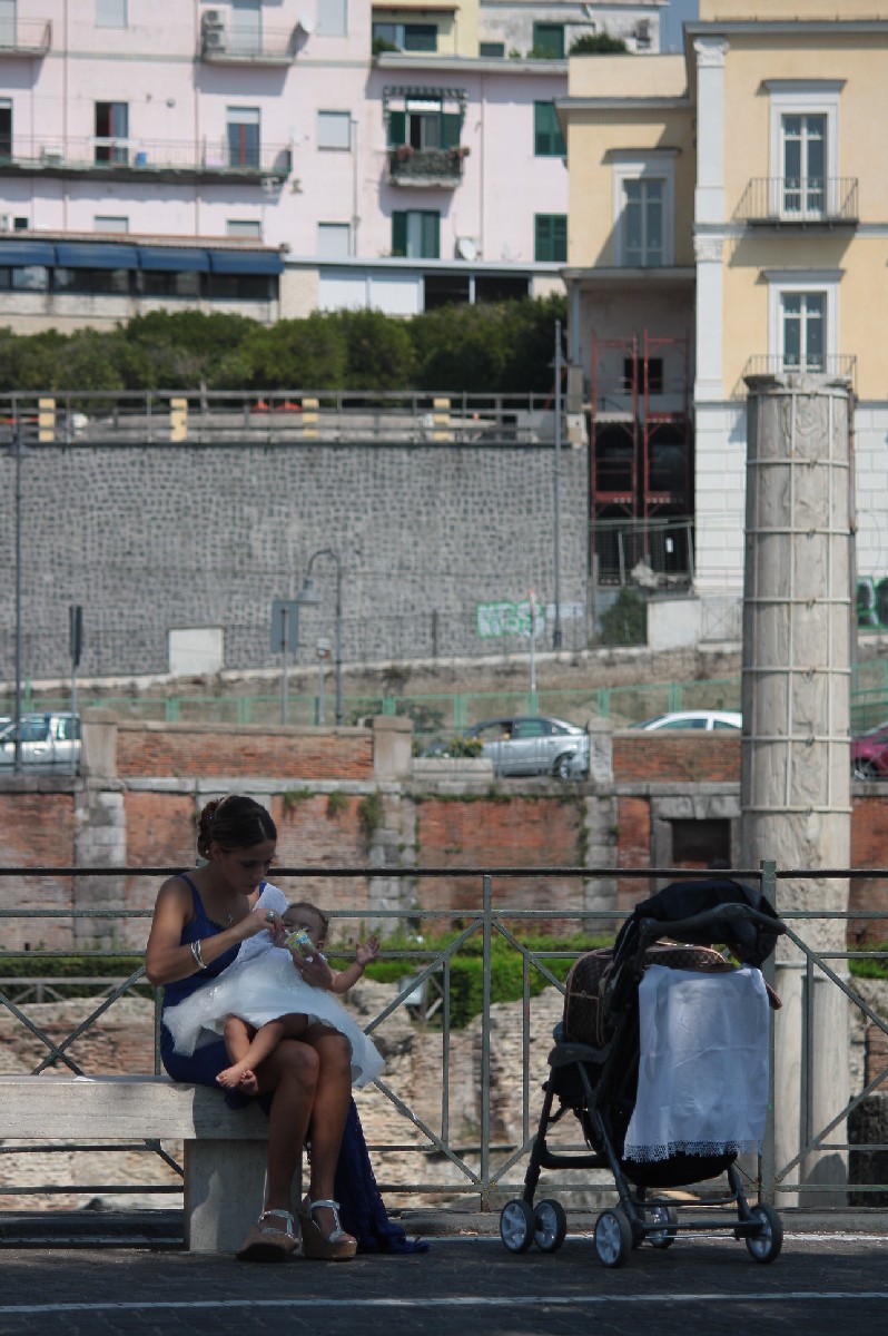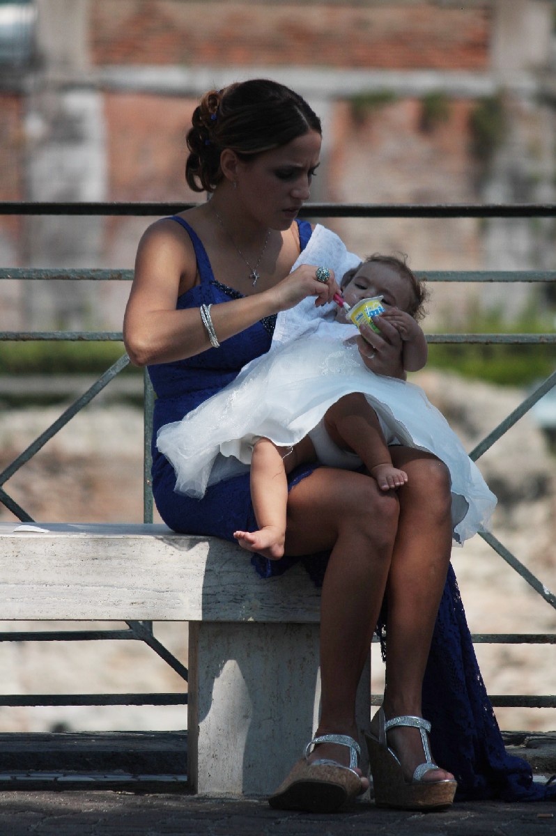 Ma è stata soprattutto l’immagine dei pittoreschi invitati, che sostavano stanchi e accaldati sulle panchine, chiacchierando e cullando un neonato, a regalarmi uno di quei contrasti che restano impressi nelle memorie di viaggio.