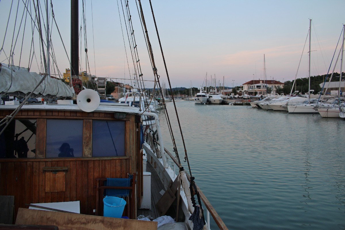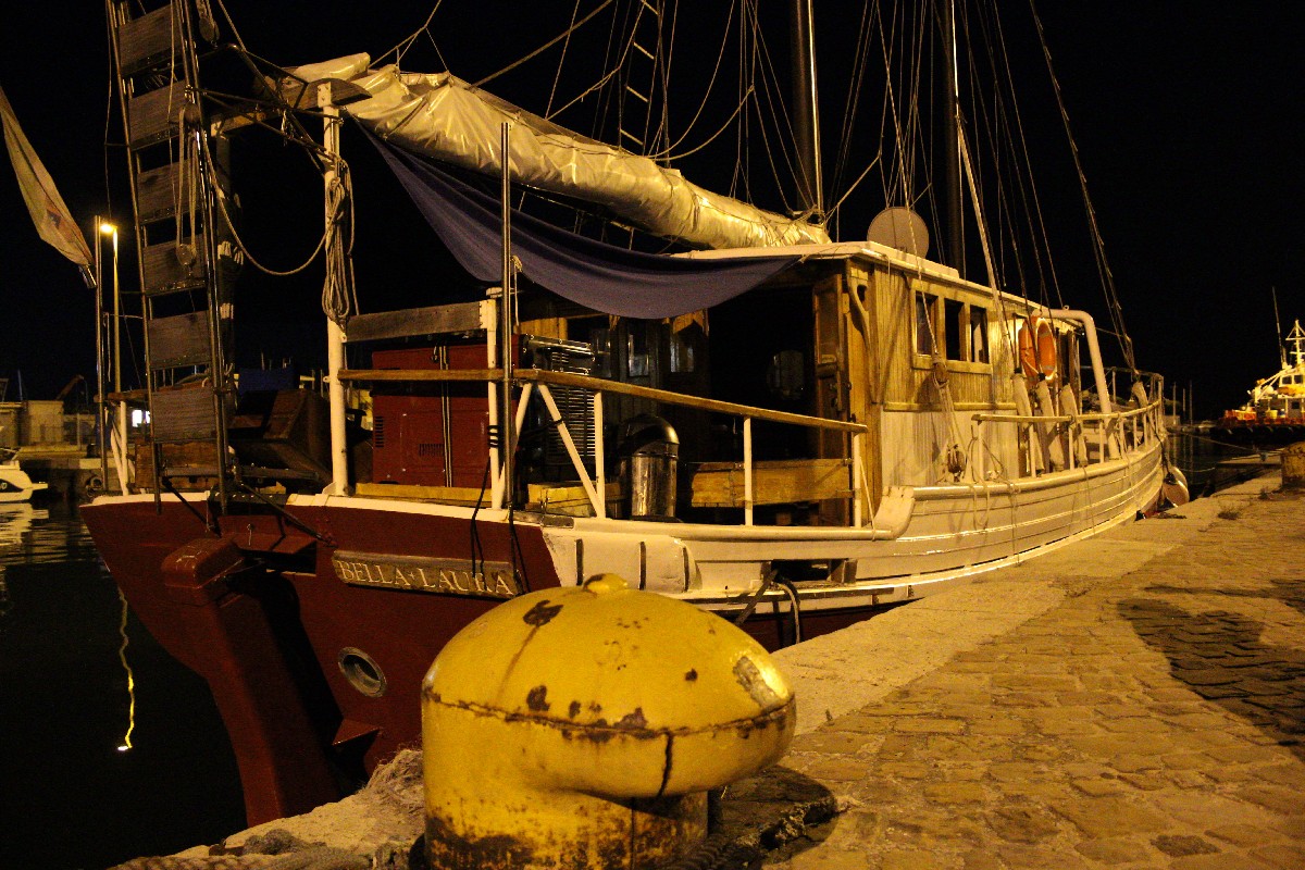 Il viaggio è partito da Pesaro, dove abbiamo fatto base per qualche giorno in porto, per portare a termine i necessari lavori di manutenzione. La goletta Bella Laura ha una storia particolare alle spalle, in parte rimasta avvolta nel mistero: la barca apparteneva a un capitano pesarese, che la amava molto. Alla morte del capitano i figli hanno deciso di venderla, ma la Bella Laura era ormai diventata un punto fermo per i pesaresi che frequentano il porto: fra loro, un gruppo di amici che usano ritrovarsi al porto a chiacchierare, e che ci hanno offerto dolci e spumante per brindare alla nuova partenza della bella goletta.