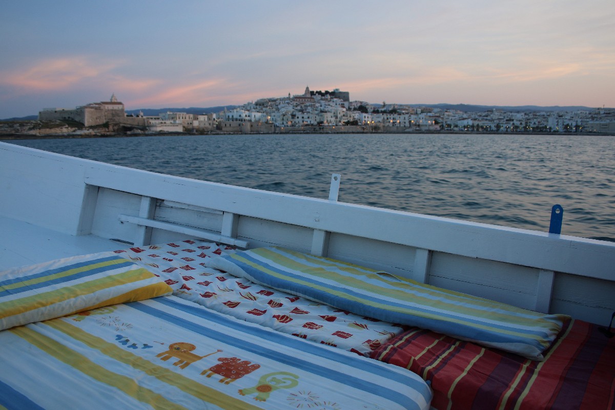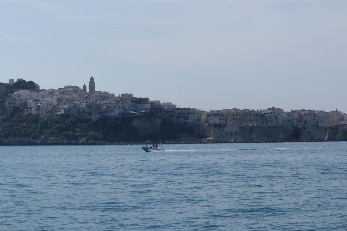 Giunti vicino alla Puglia, abbiamo gettato l’ancora nei pressi di Vieste per un bagno rigenerante, con la bianca costa pugliese in vista, oltre il confine blu del mare. A causa di un problema tecnico, io e Teresina abbiamo dovuto raggiungere la terraferma per cercare un negozio di nautica: ci ha aiutate Matteo, pugliese di origini croate, che con la sua bianca barca Il Leone di Vesta organizza gite lungo le più belle coste del Gargano, ci ha traghettate dalla Meloria fino a Vieste, e ci ha accompagnate in macchina a cercare aiuto.